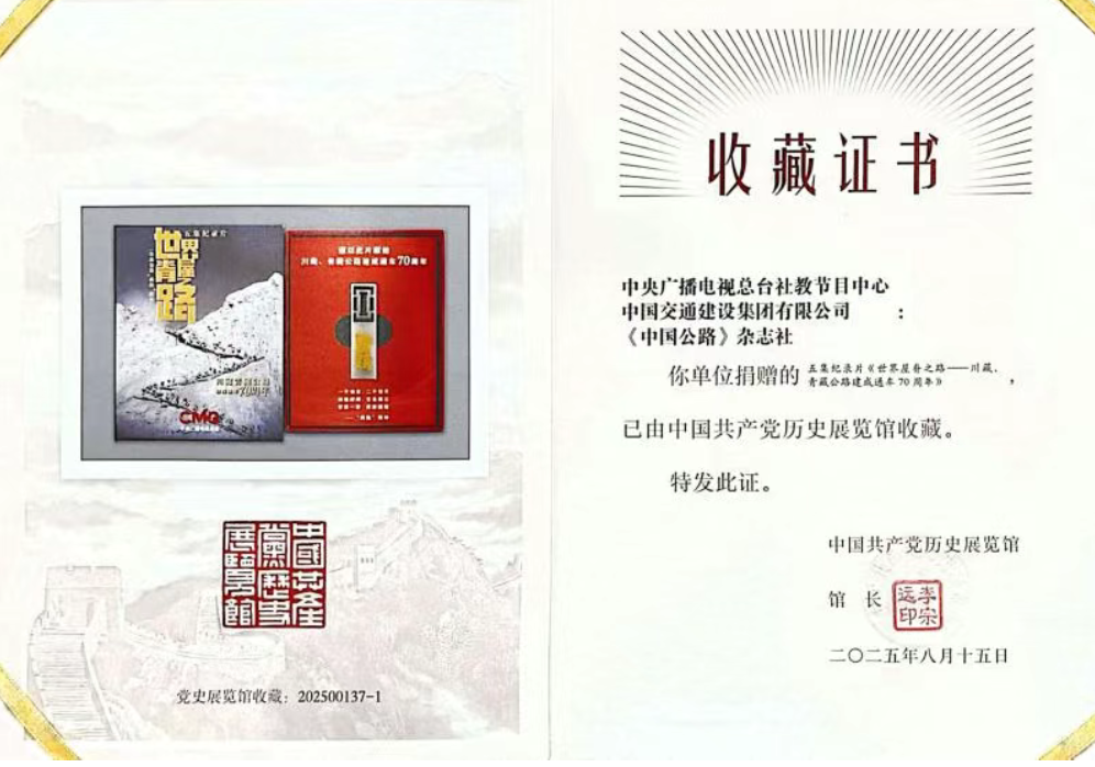 近日,由中央广播电视总台社教节目中心、中交集团、《中国公路》杂志社联合制作的五集纪录片《世界屋脊之路——川藏、青藏公路建成通车70周年》被中国共产党历史展览馆收藏。这是党史馆建馆以来颁发收藏证书的第一部纪录片,也是继大型情景史诗舞台艺术电影《伟大征程》之后颁发收藏证书的第二部影视作品。