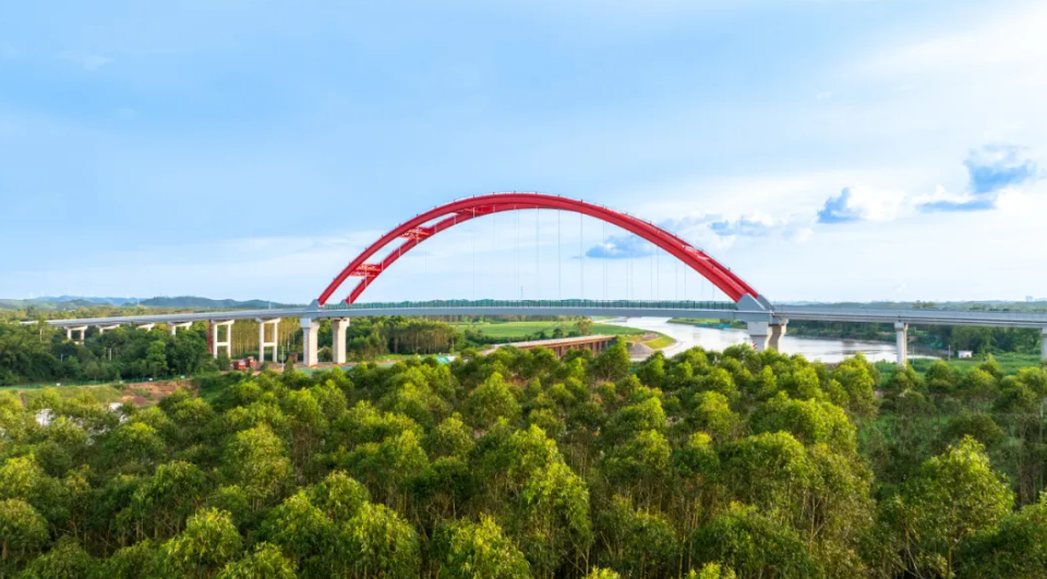 此次通车的东坝村大桥位于钦州市钦南区久隆镇,全长1172.08米(含引桥),全桥采用双向两车道四级公路标准,设计通行时速20公里,设置专用人行通道,主桥拱肋为哑铃型截面设计,全桥拱肋划分为18个节段,单幅设置9个节段,最大吊装节段重量达44.2吨。