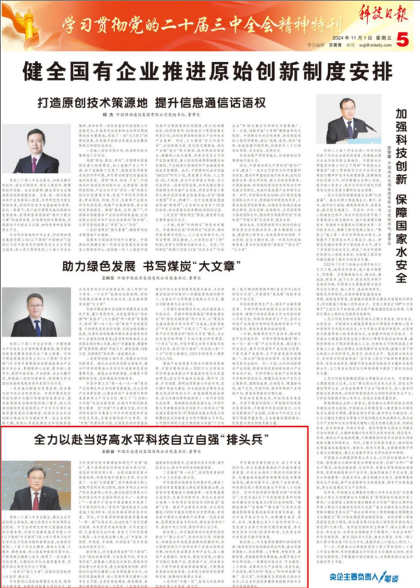 11月1日,《科技日报》发表中交集团党委书记、董事长王彤宙署名文章《全力以赴当好高水平科技自立自强“排头兵”》。现将文章转载如下: