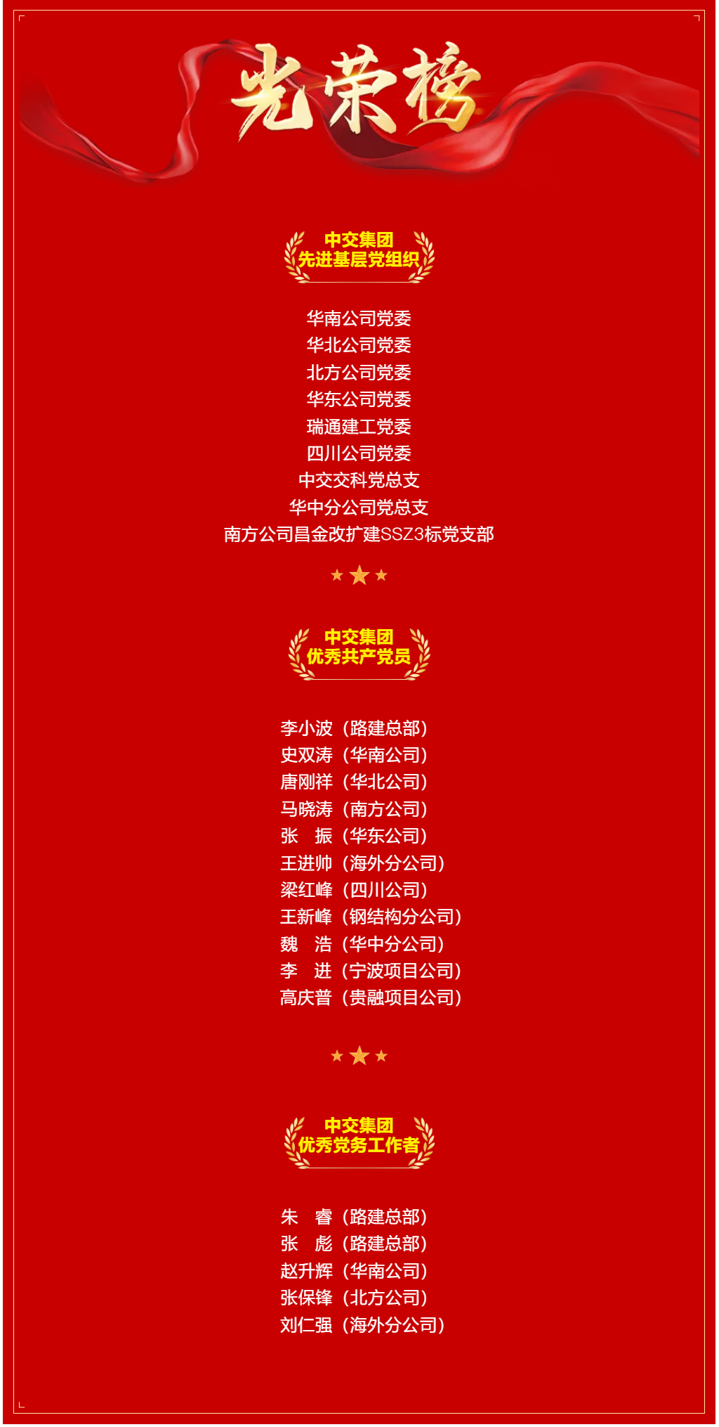 中交路建多个集体和个人获中交集团“两优一先”表彰