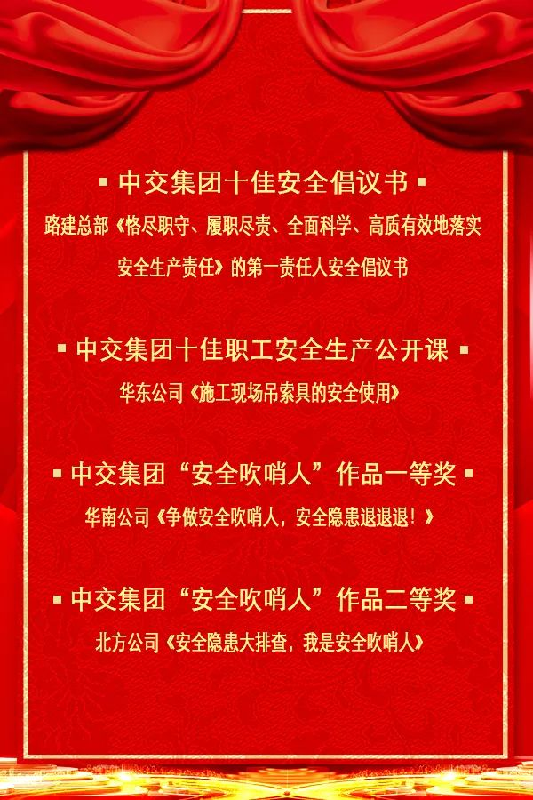 中交路建积极响应,以防范化解重大风险、及时消除安全隐患、有效遏制生产安全事故为重点,创作了一批主题鲜明、形式多样、重点突出的安全教育文化作品,推荐的四部参赛作品获奖。其中获中交集团十佳安全倡议书1项、中交集团十佳职工安全生产公开课1项、中交集团“安全吹哨人”作品评比一等奖1项、二等奖1项。获奖名单如下: