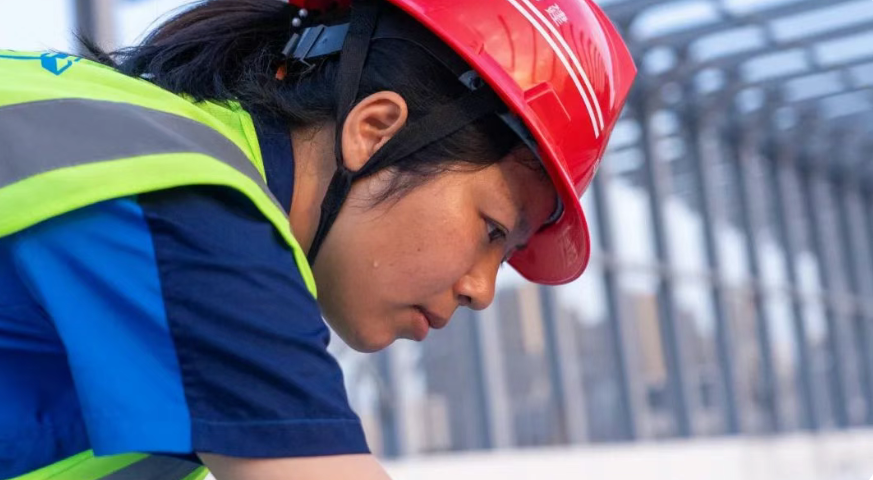她半蹲在索塔下,用手比划着焊缝,阳光照射在她的脸上,因常年风吹日晒而有些干裂的皮肤显得更加黝黑,汗水顺着她的安全帽带滑落,在图纸上洇开一小片深色。